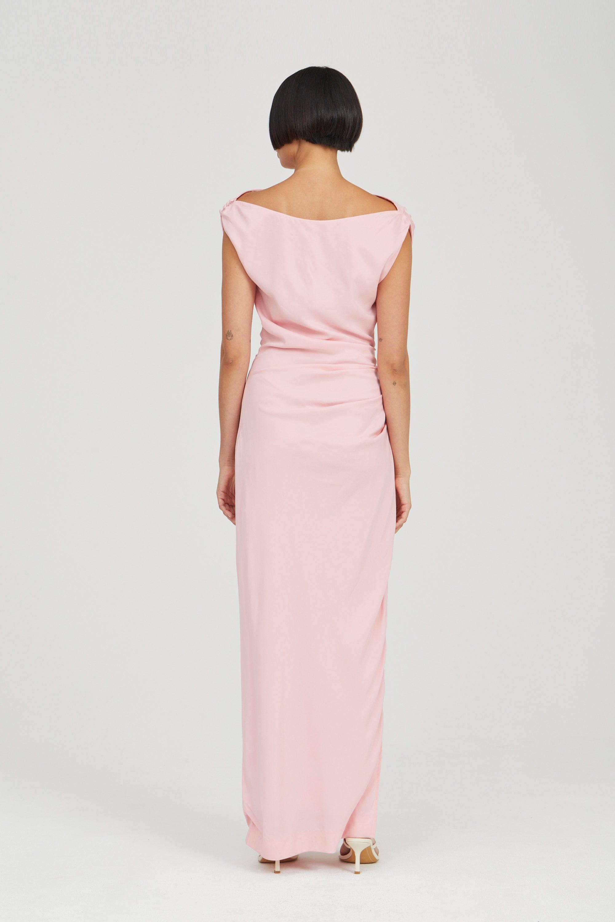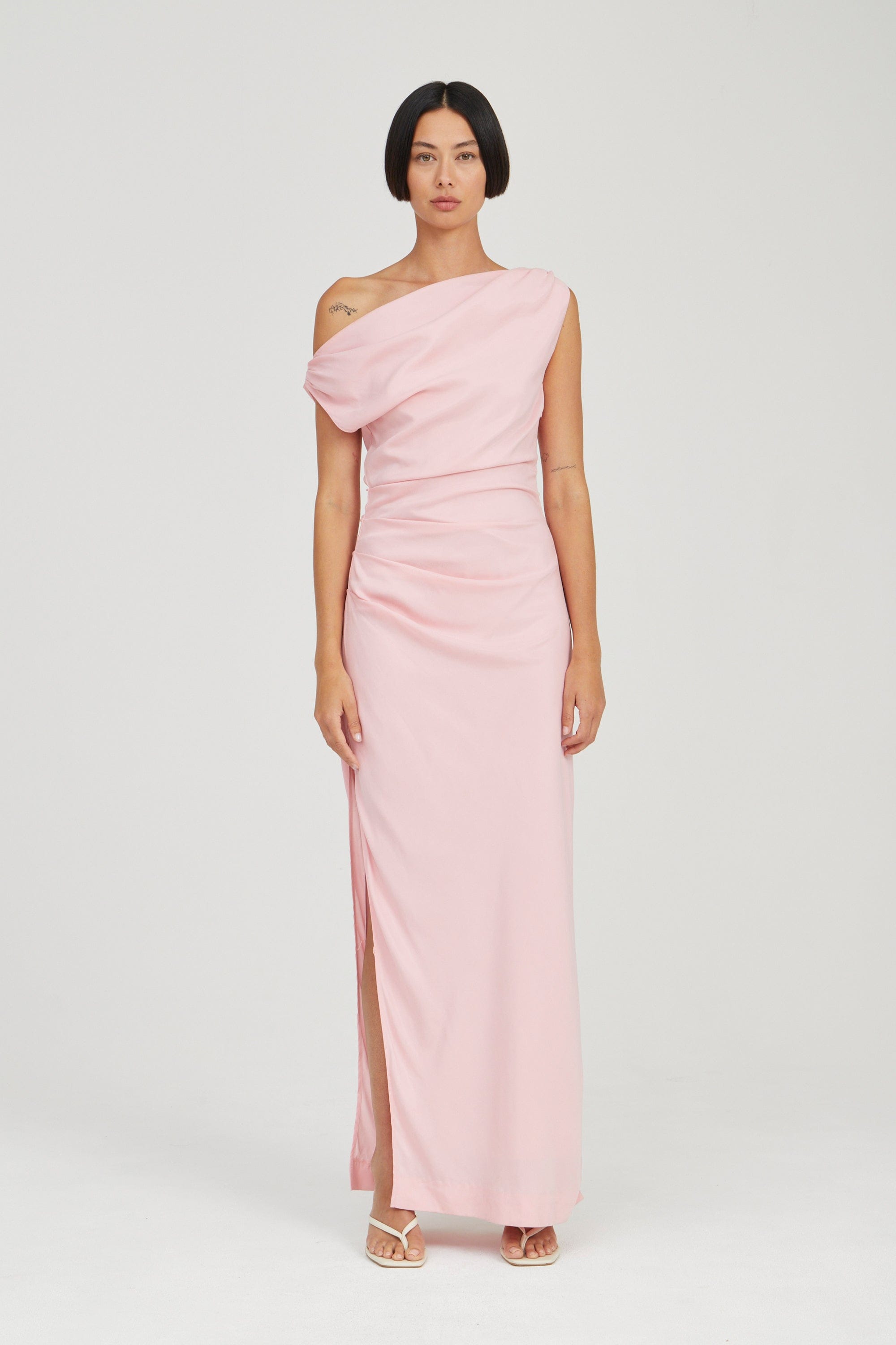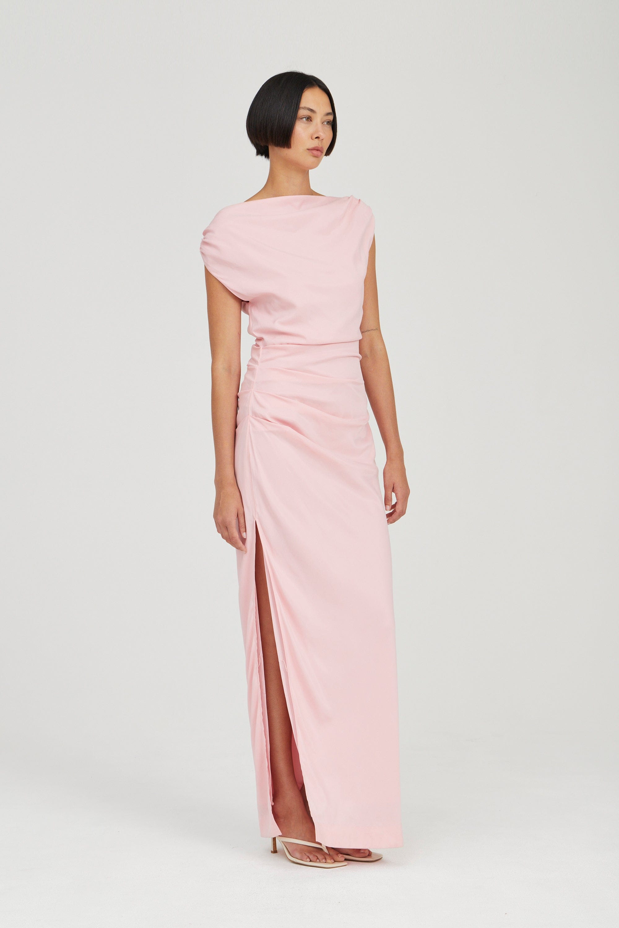 The Athena Off Shoulder Maxi Dress is designed to drape effortlessly over the body with a refined fit. Featuring a cowl neckline that sits off the shoulder, it offers a flattering shape. Tuck detailing along the shoulder seam and a covered button on the left shoulder add subtle details.