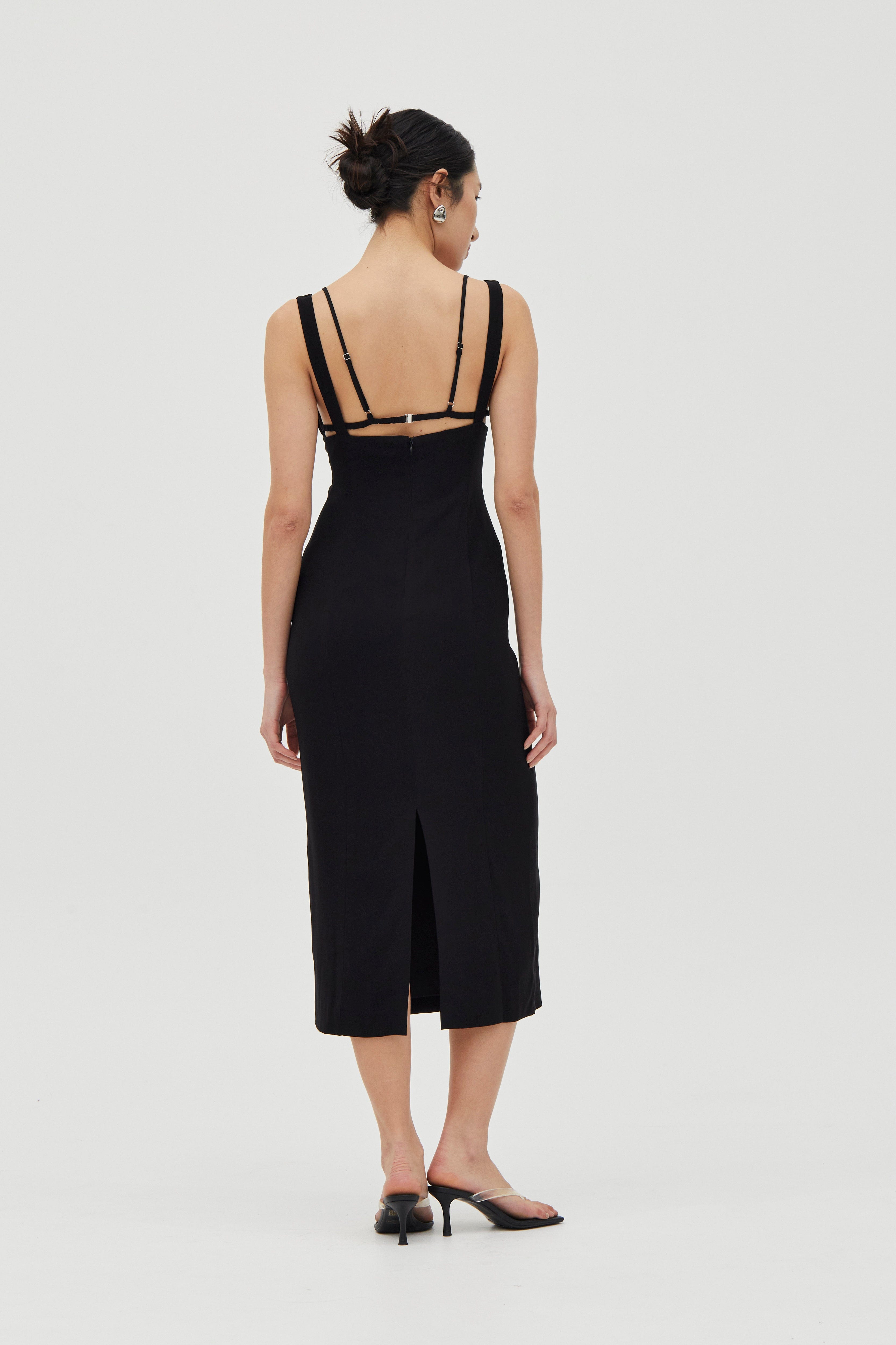 The Lucent Jewel Slip Dress is cut to a slim, panelled silhouette that follows the body with ease. A bralette-style bust with dual-layer detailing introduces subtle structure, finished with a delicate beaded stone accent at the under-bra for a refined, understated finish.