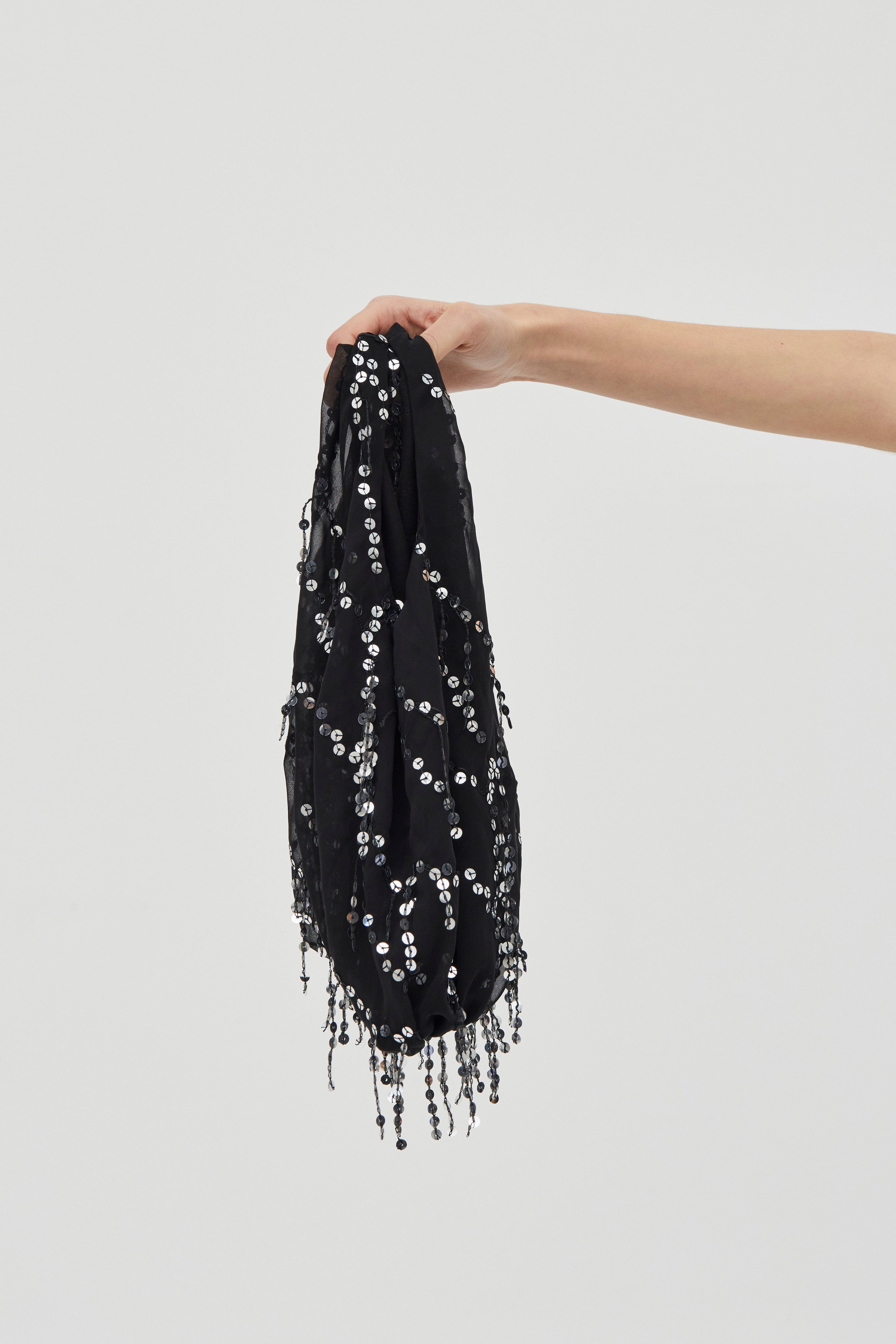 • Sheer, delicate fabrication with attached silver sequins