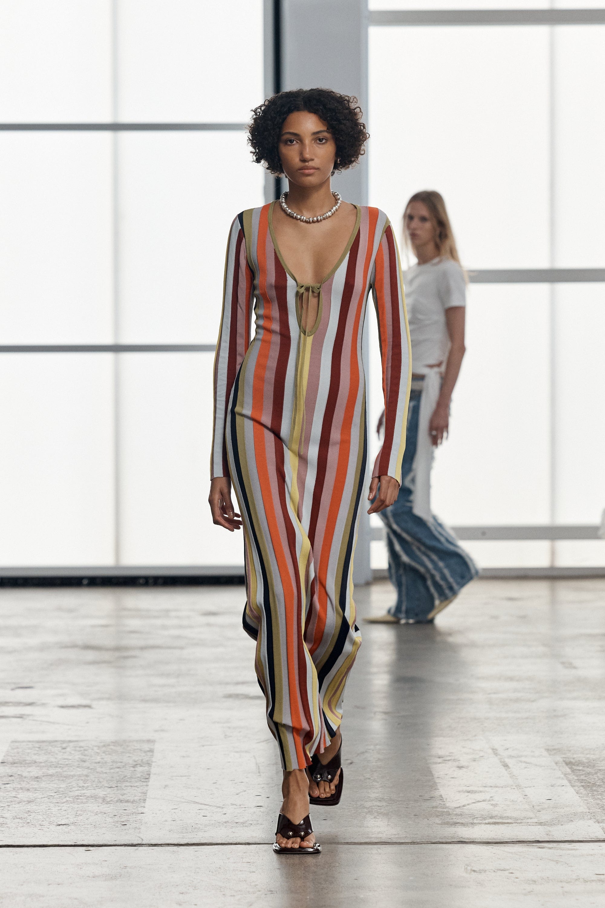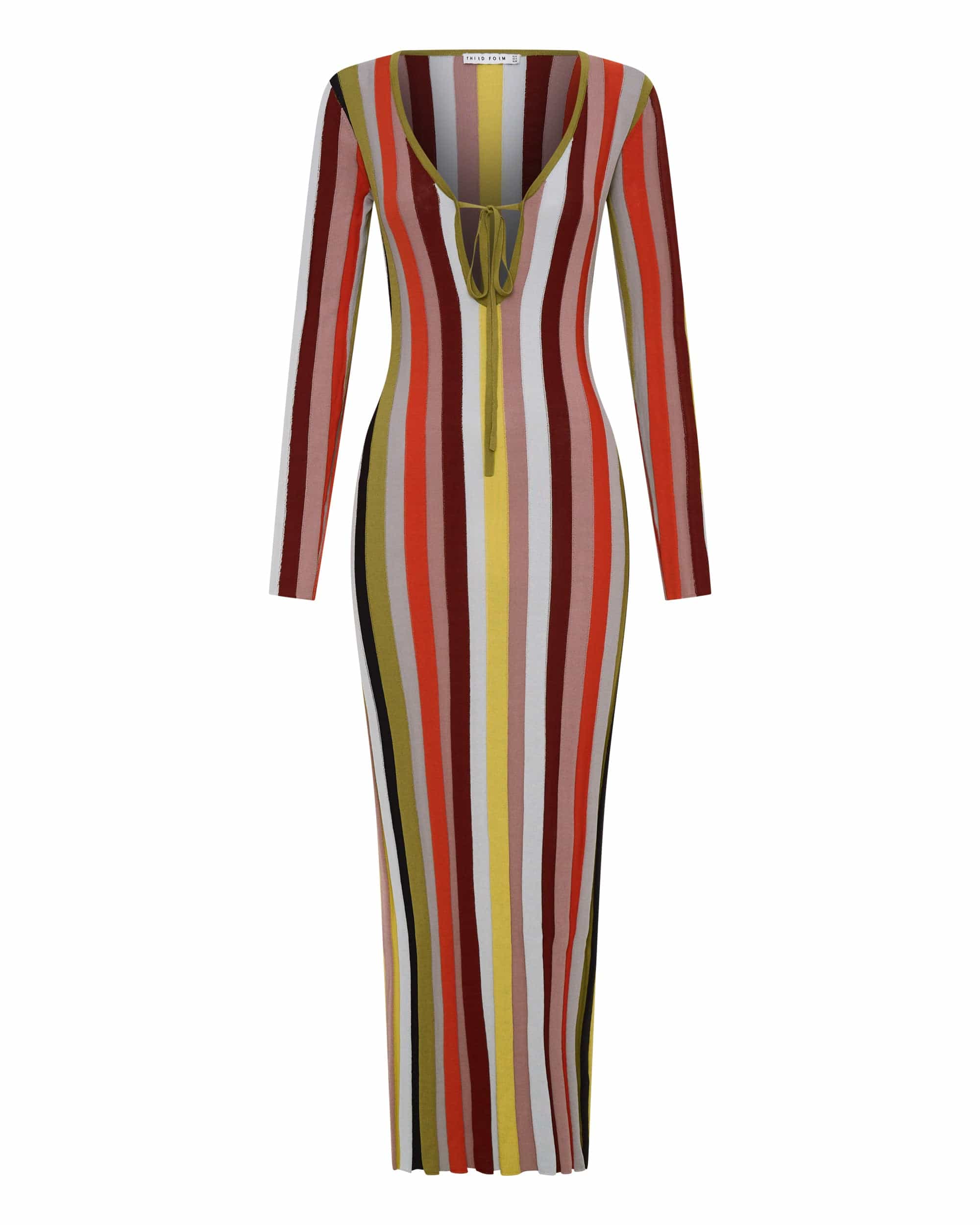 The Rhythm Knit Maxi Dress brings a modern edge to statement knitwear. Cut to a slim silhouette with long sleeves, it features a deep tie-front neckline with multi-wear styling options for a personalised fit. The floor-length design elongates the form, while the vertical stripe knit adds movement and direction.