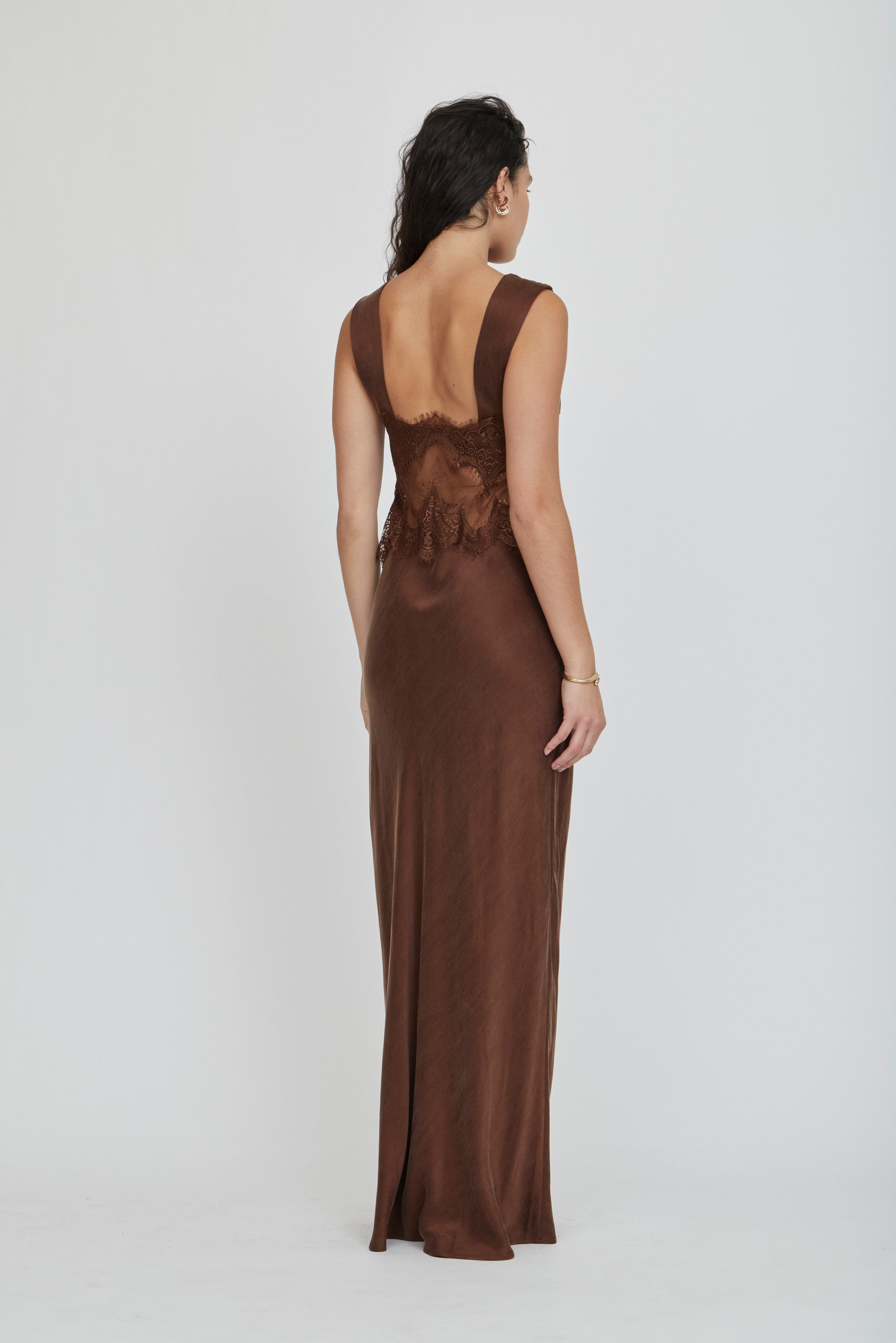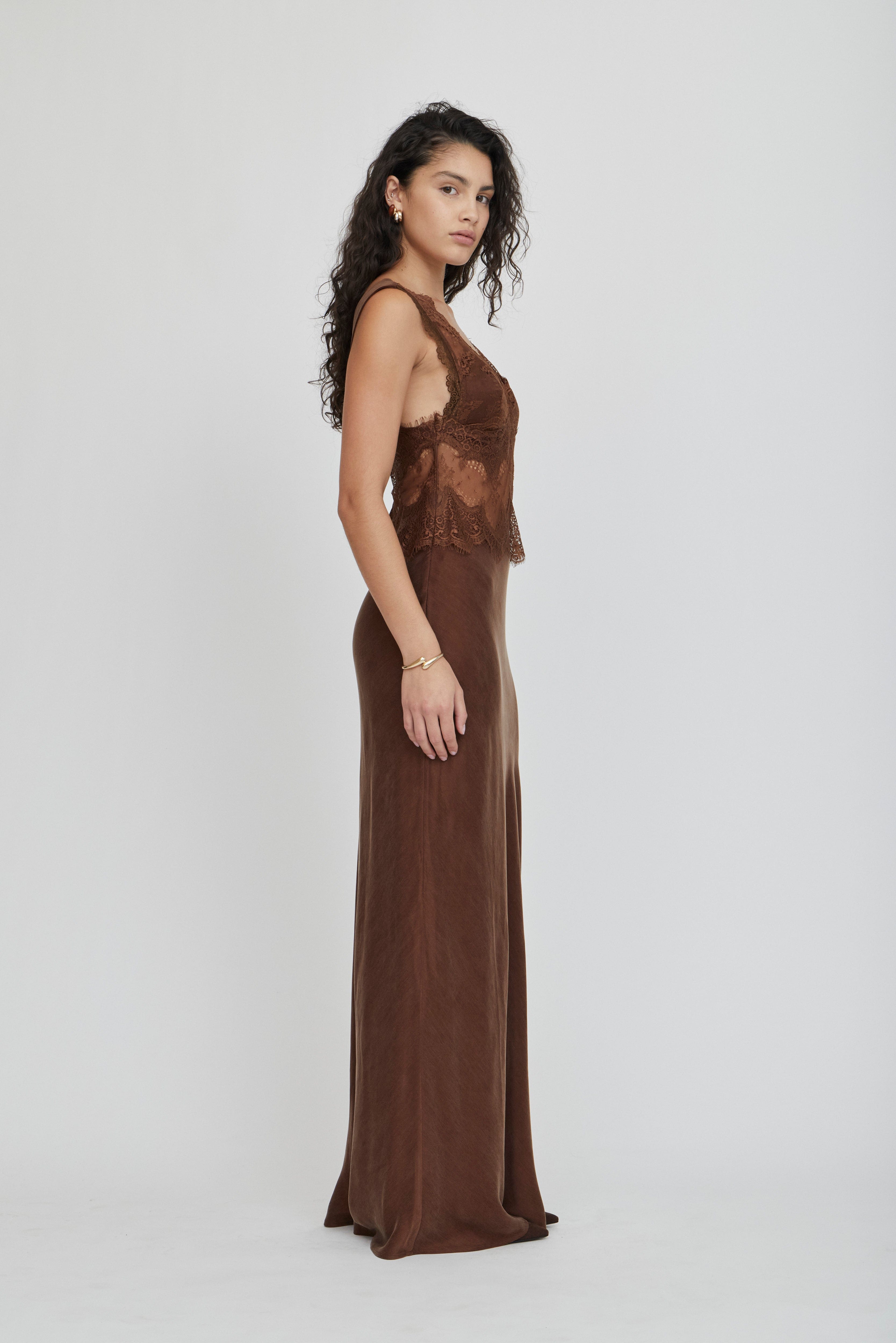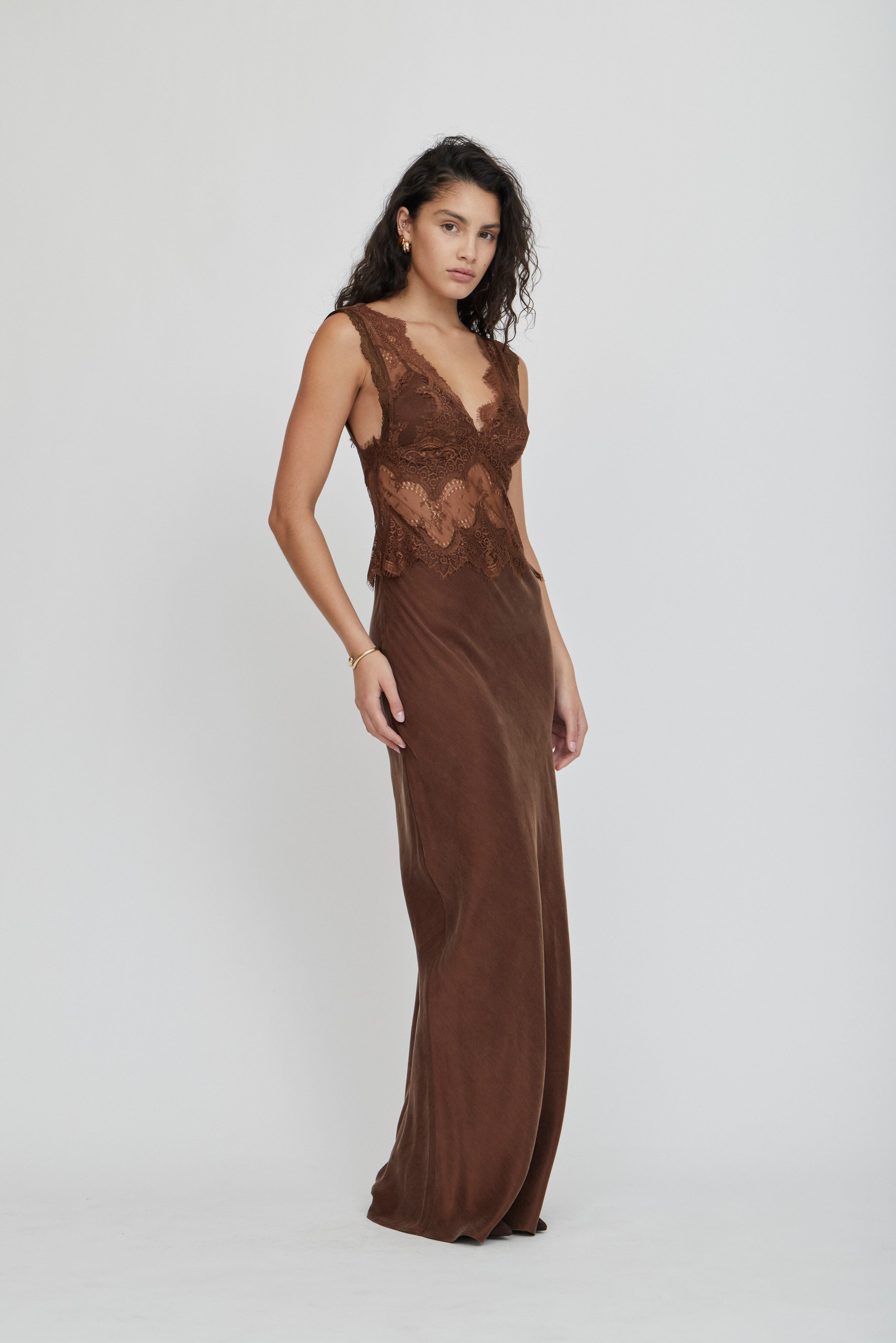 VISIONS LACE FLOOR LENGTH DRESS | CHOCOLATE