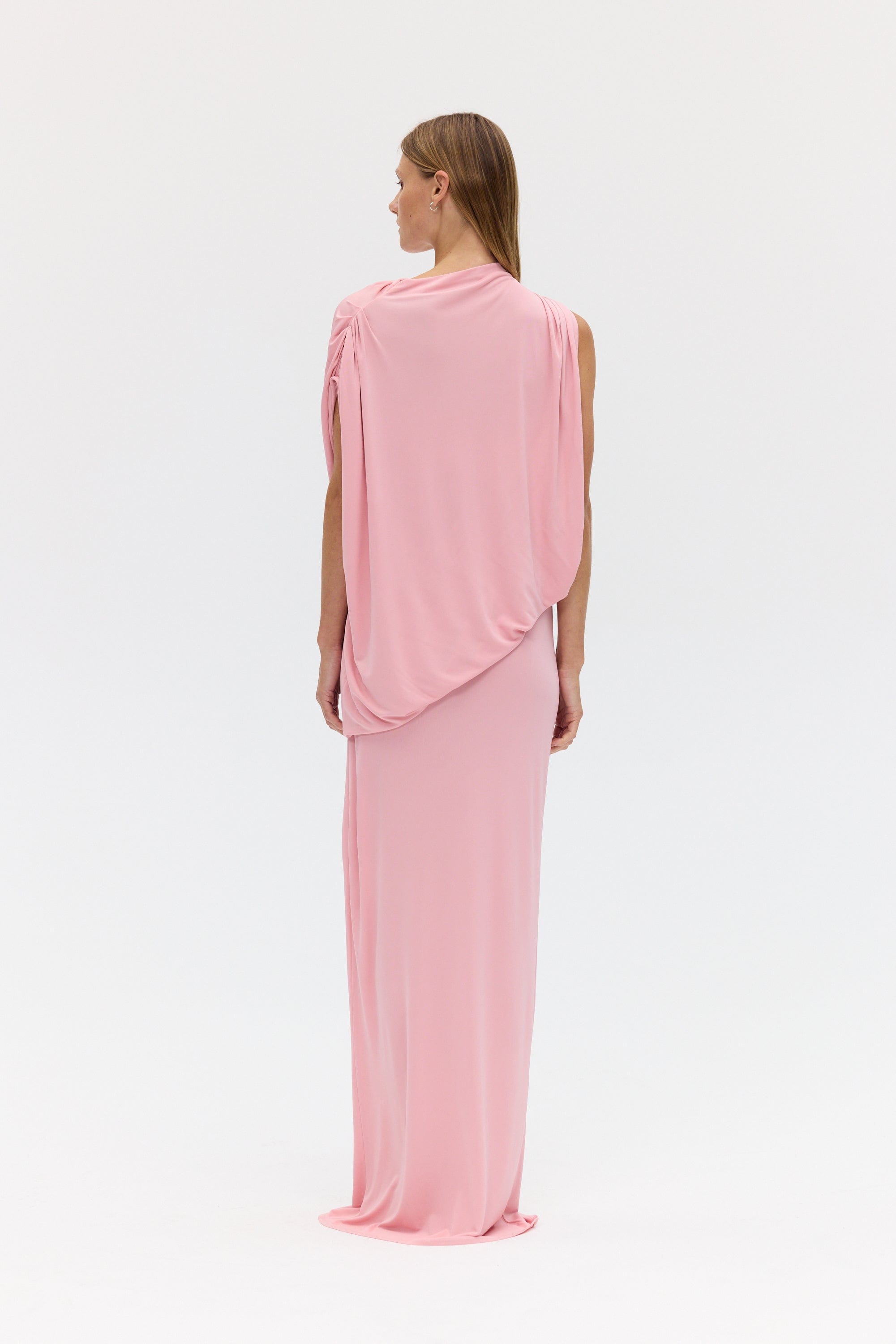 - Asymmetric draped bodice attaching to the skirt at the waistline