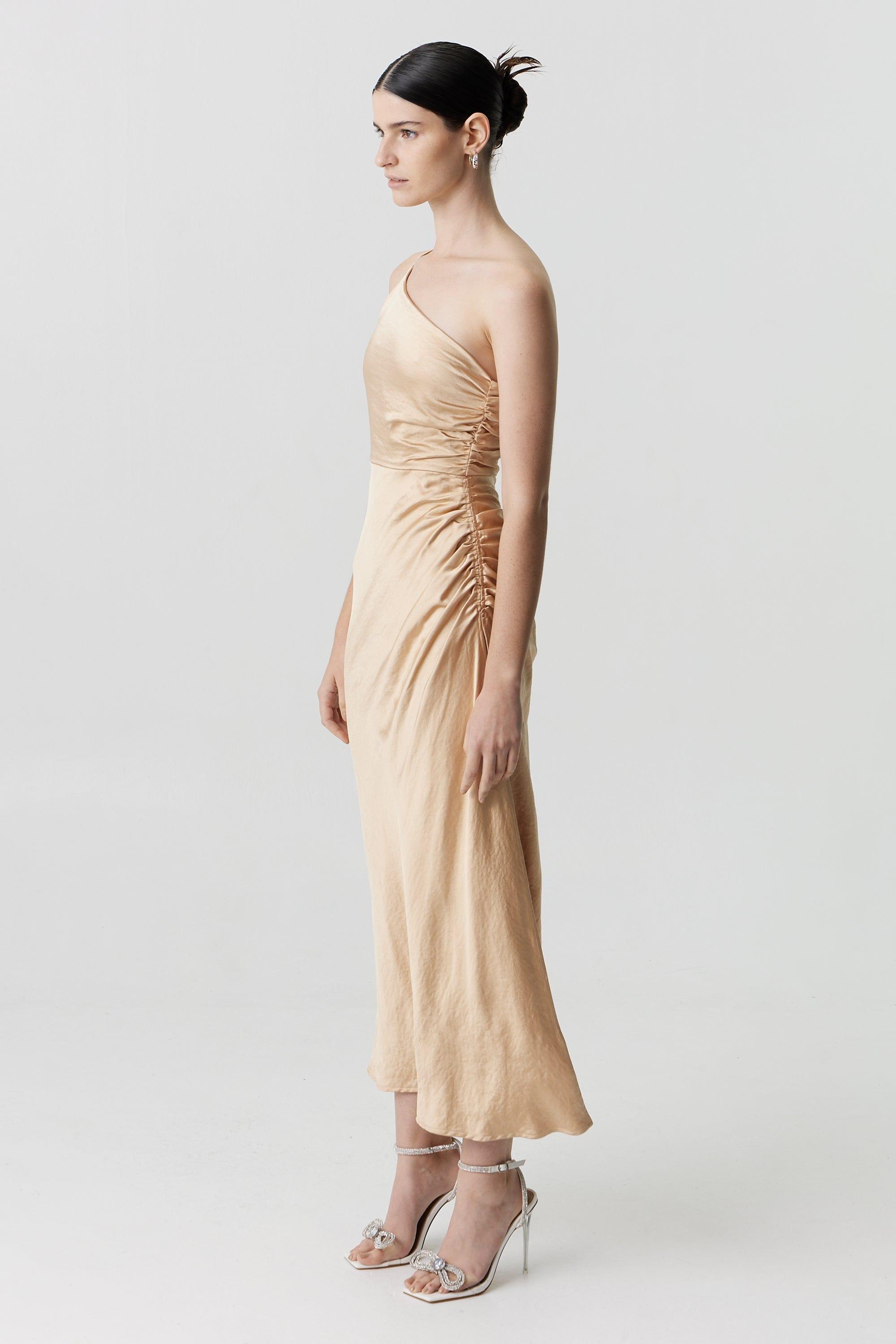 SATIN GATHER ONE SHOULDER DRESS | SAND