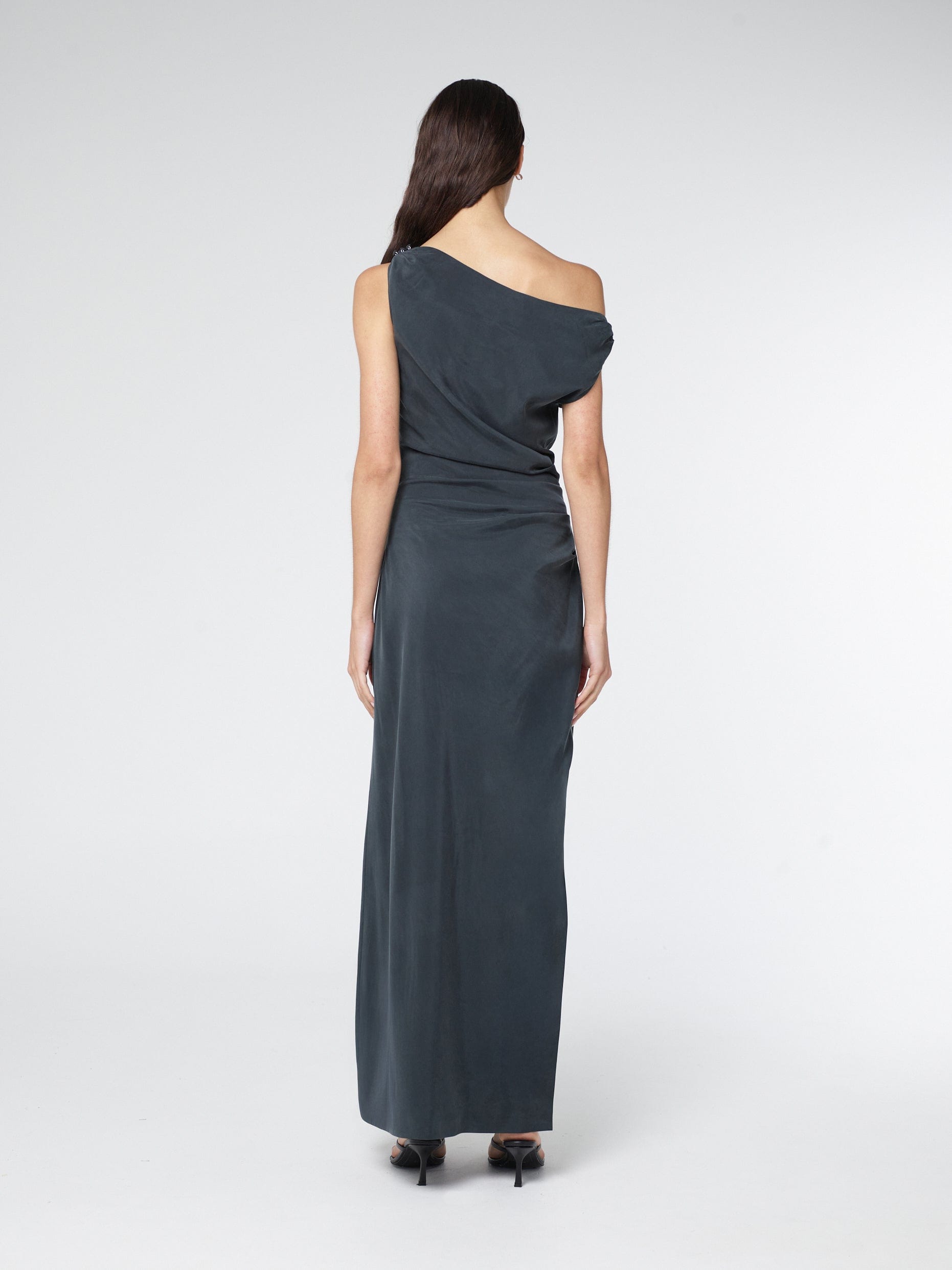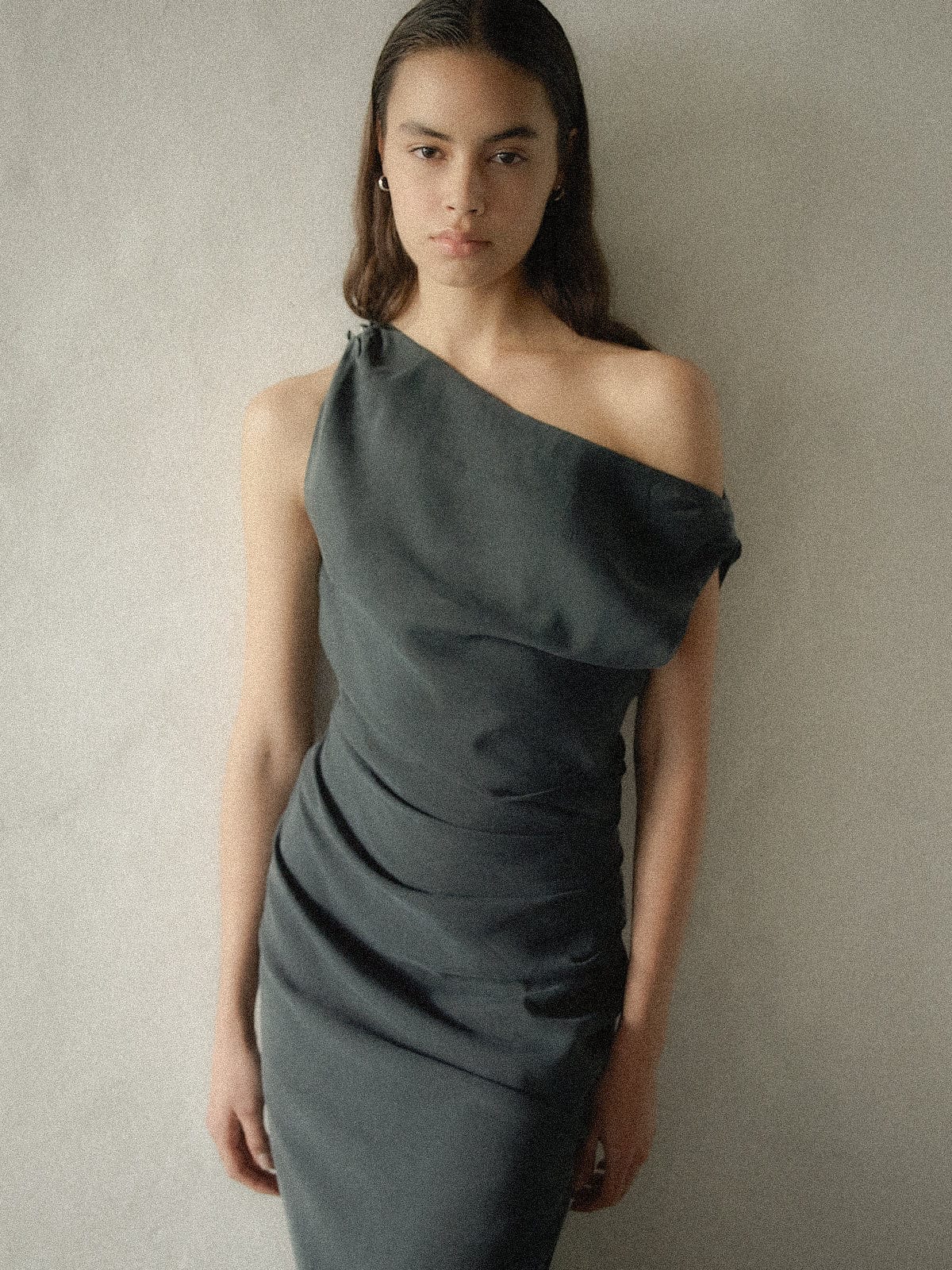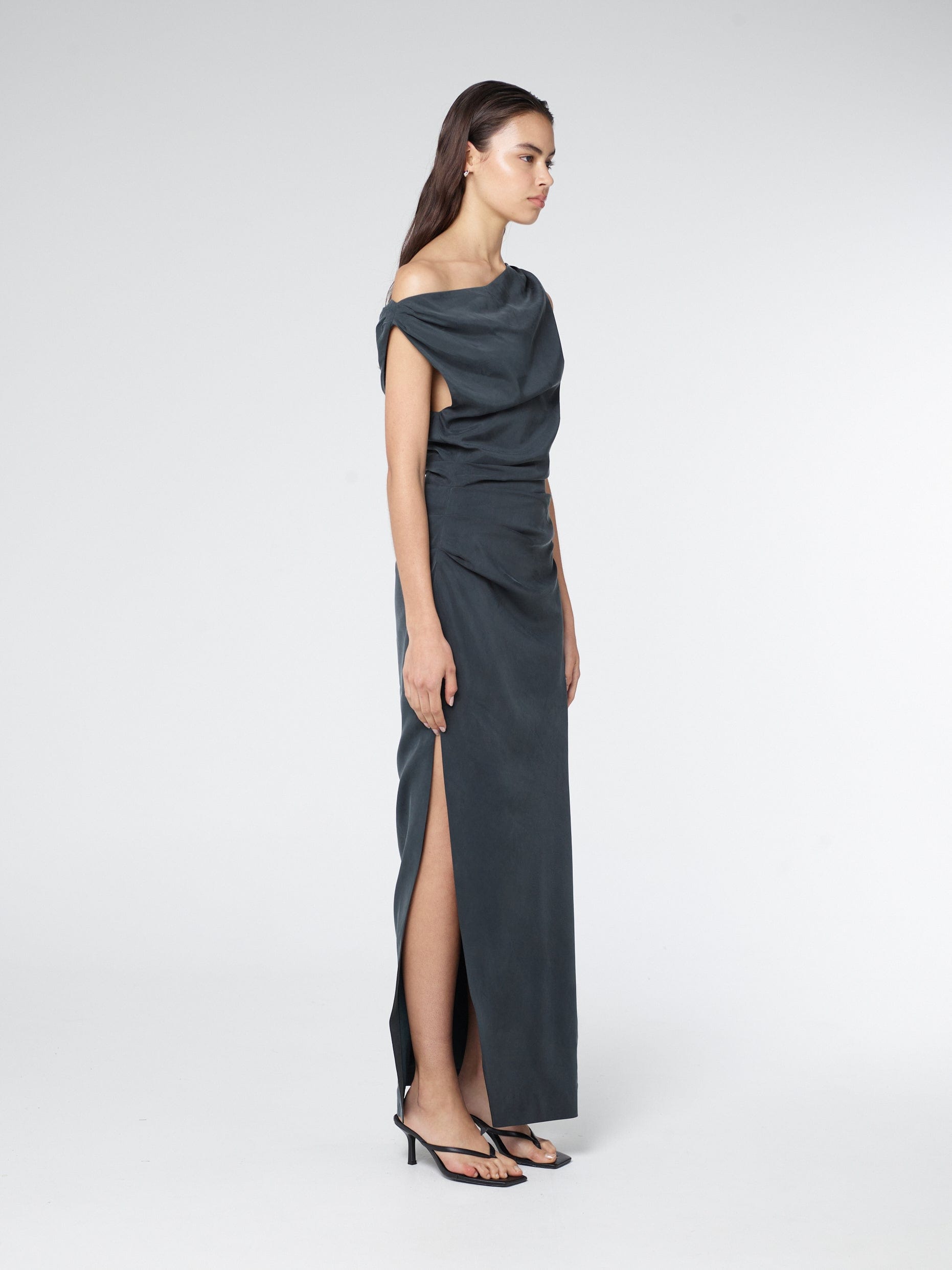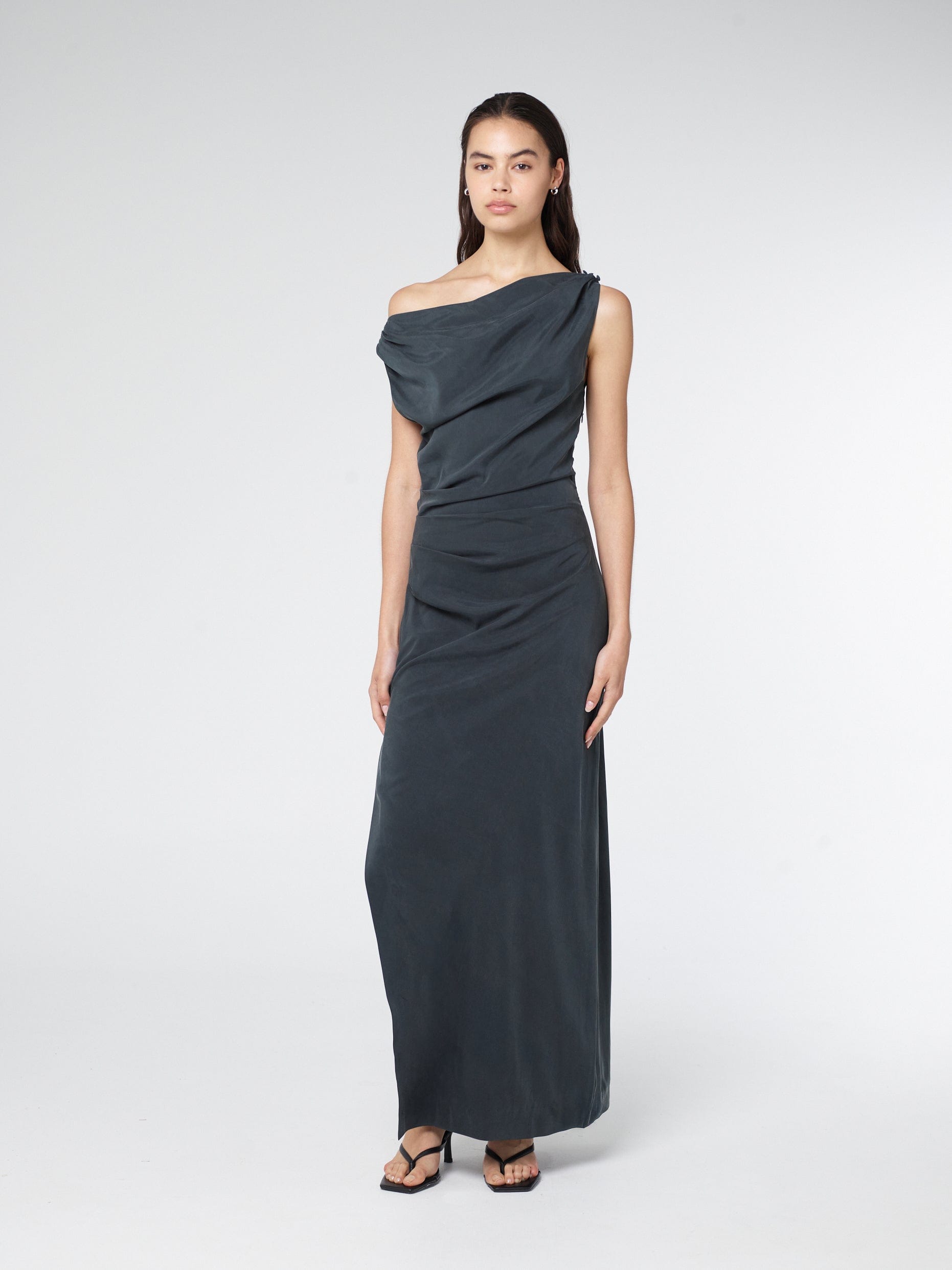 The Athena Off Shoulder Maxi Dress is designed to drape effortlessly over the body with a refined fit. Featuring a cowl neckline that sits off the shoulder, it offers a flattering shape. Tuck detailing along the shoulder seam and a covered button on the left shoulder add subtle details.