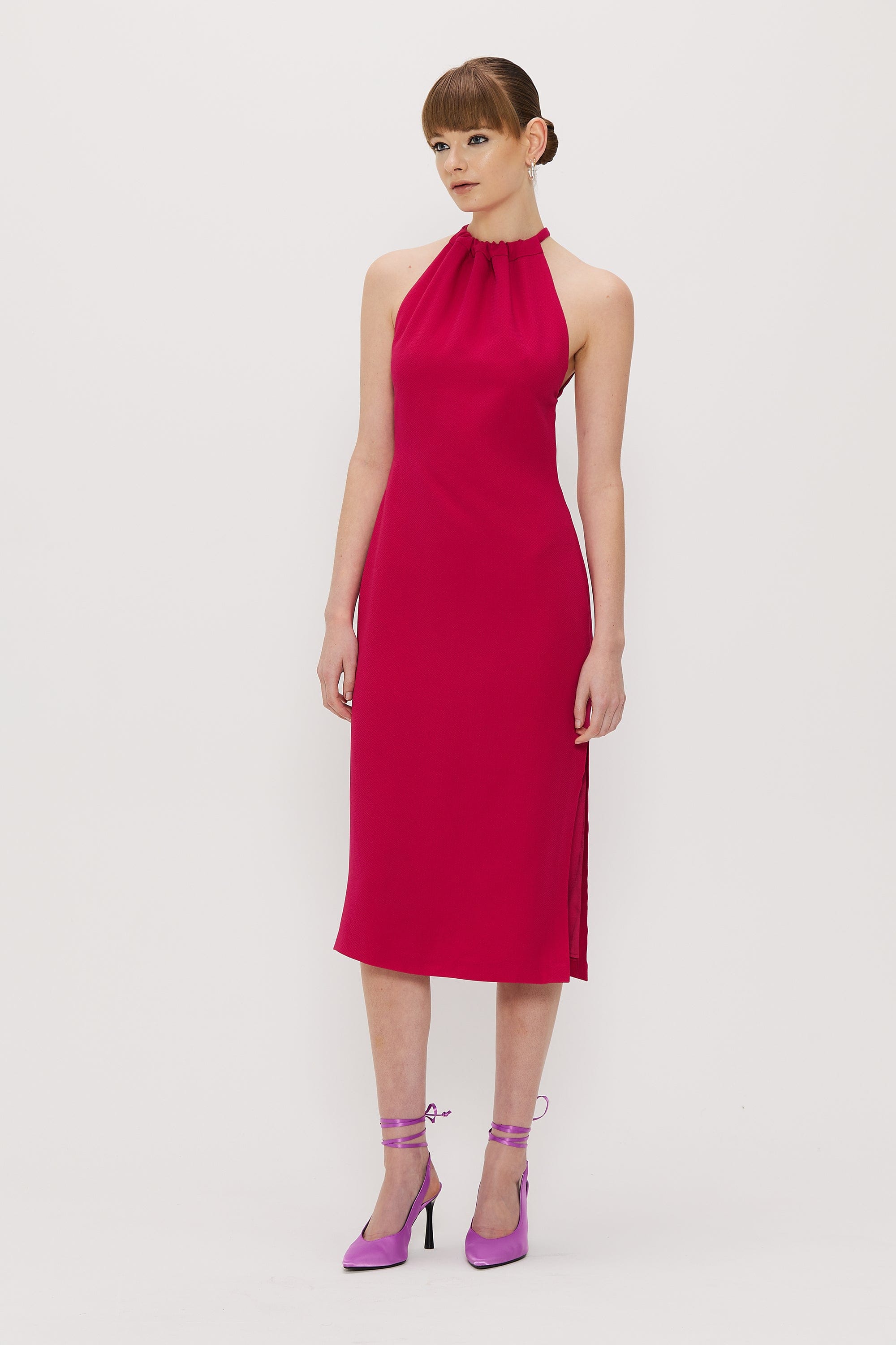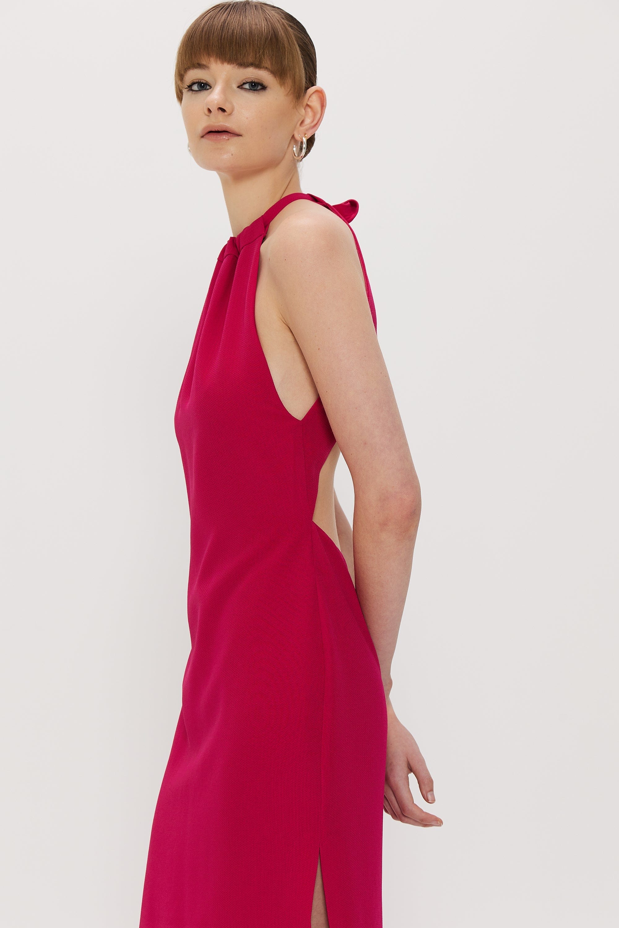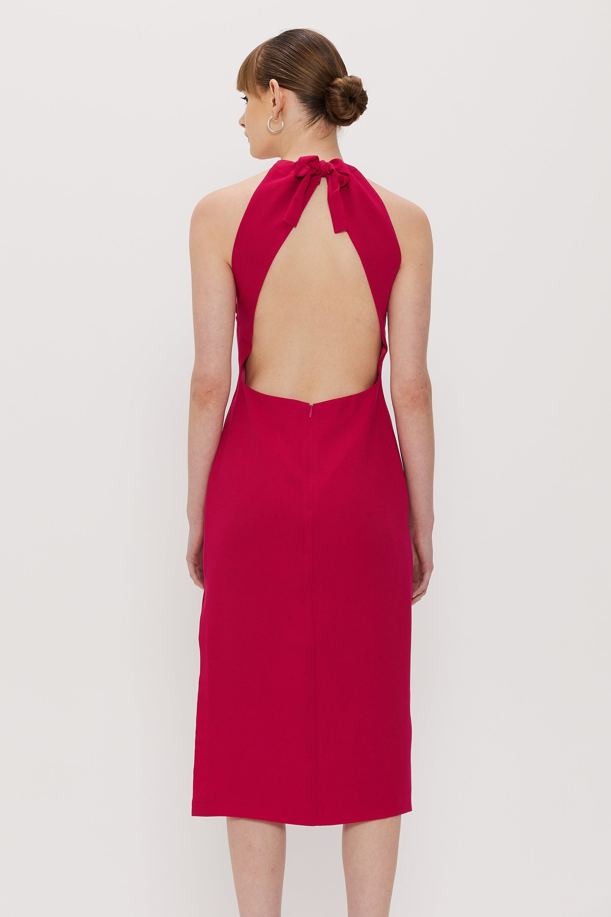 The Come Closer Midi Dress is the epitome of chic. This piece features an elegant drawn in, raised front neck, designed with a delicate back neck tie - making for a striking silhouette. The column-shaped style finishes mid-calf, balancing the lowered back and cutaway sides. Style with a classic pump or heeled boot for an elevated look.