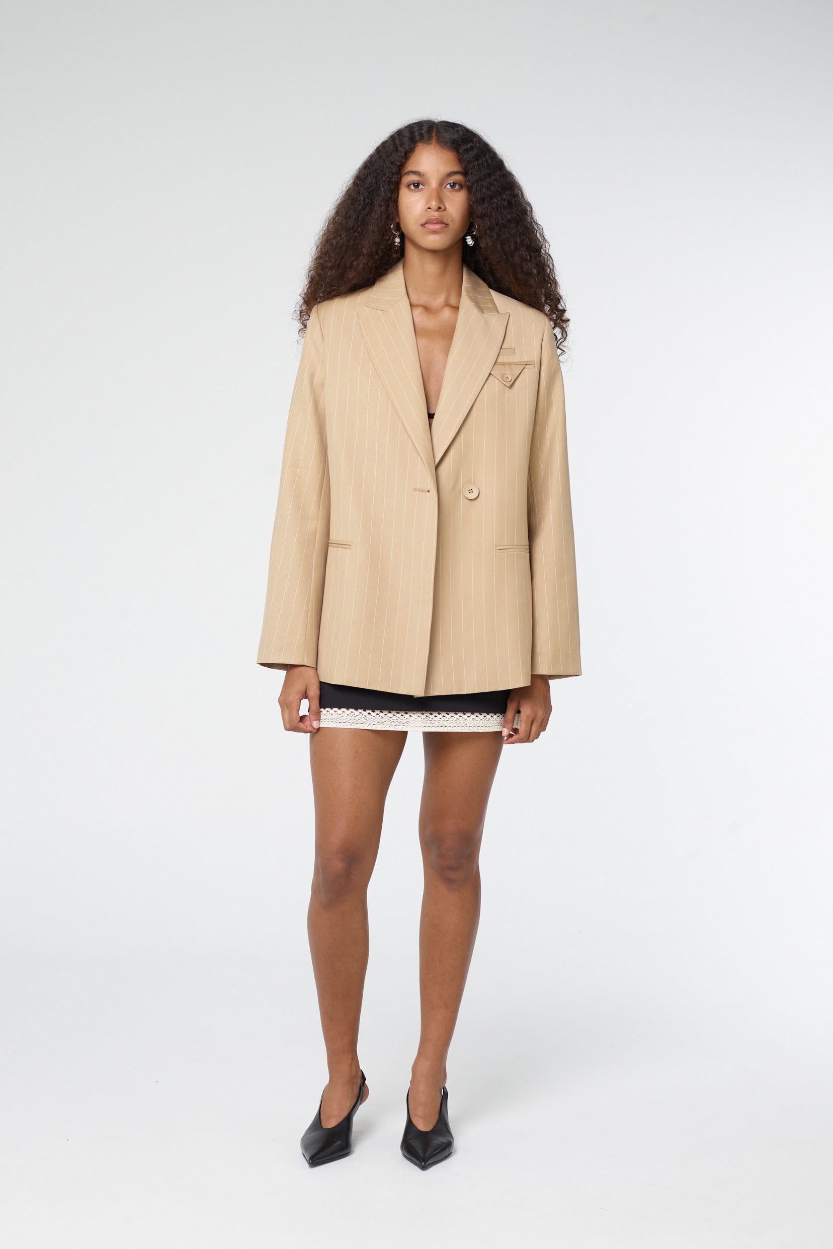 The Sable Mini Skirt reimagines classic tailoring with a contemporary edge. Designed from structured suiting fabric, it features a clean A-line silhouette and fixed waistband with subtle belt loops. A delicate contrast lace hem introduces texture and softens the minimalist cut.