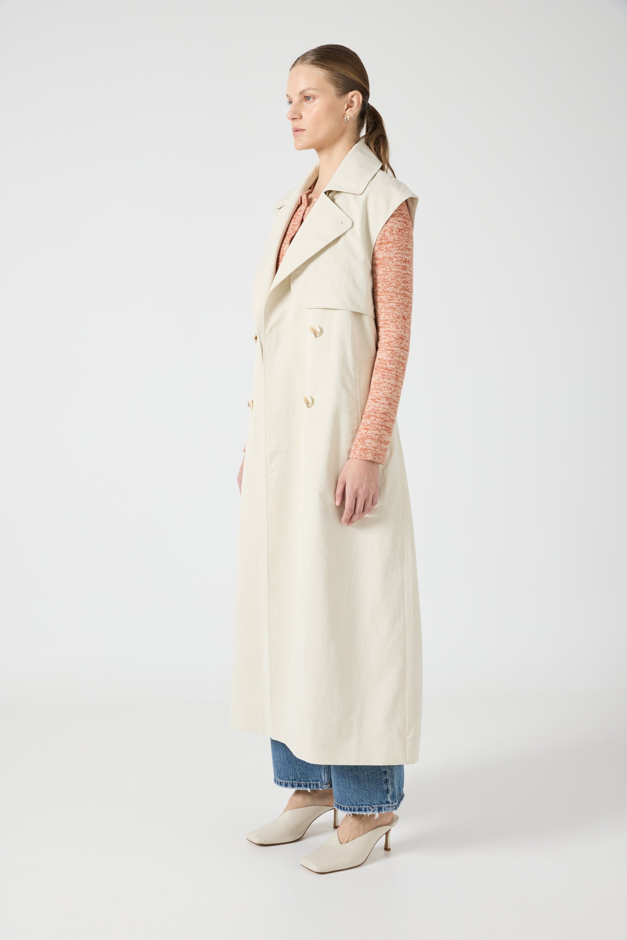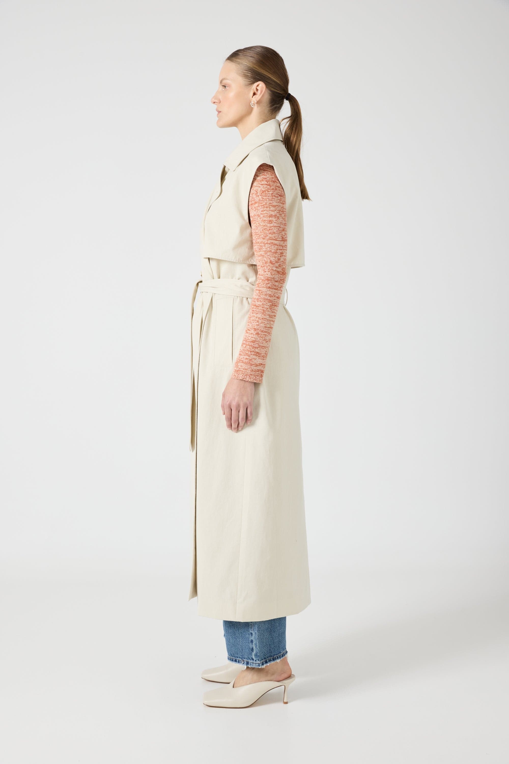 A transeasonal staple, the Sleeveless Transit Trench Coat refines classic tailoring with a streamlined, sleeveless silhouette. Crafted from a durable cotton blend, it features an oversized fit, double-breasted closure, and a self-tie belt for versatile styling. Storm flaps and sharp lapels enhance its utilitarian appeal, while its lightweight construction makes it an essential layering piece. Designed for ease and longevity, this trench offers effortless styling through the seasons.